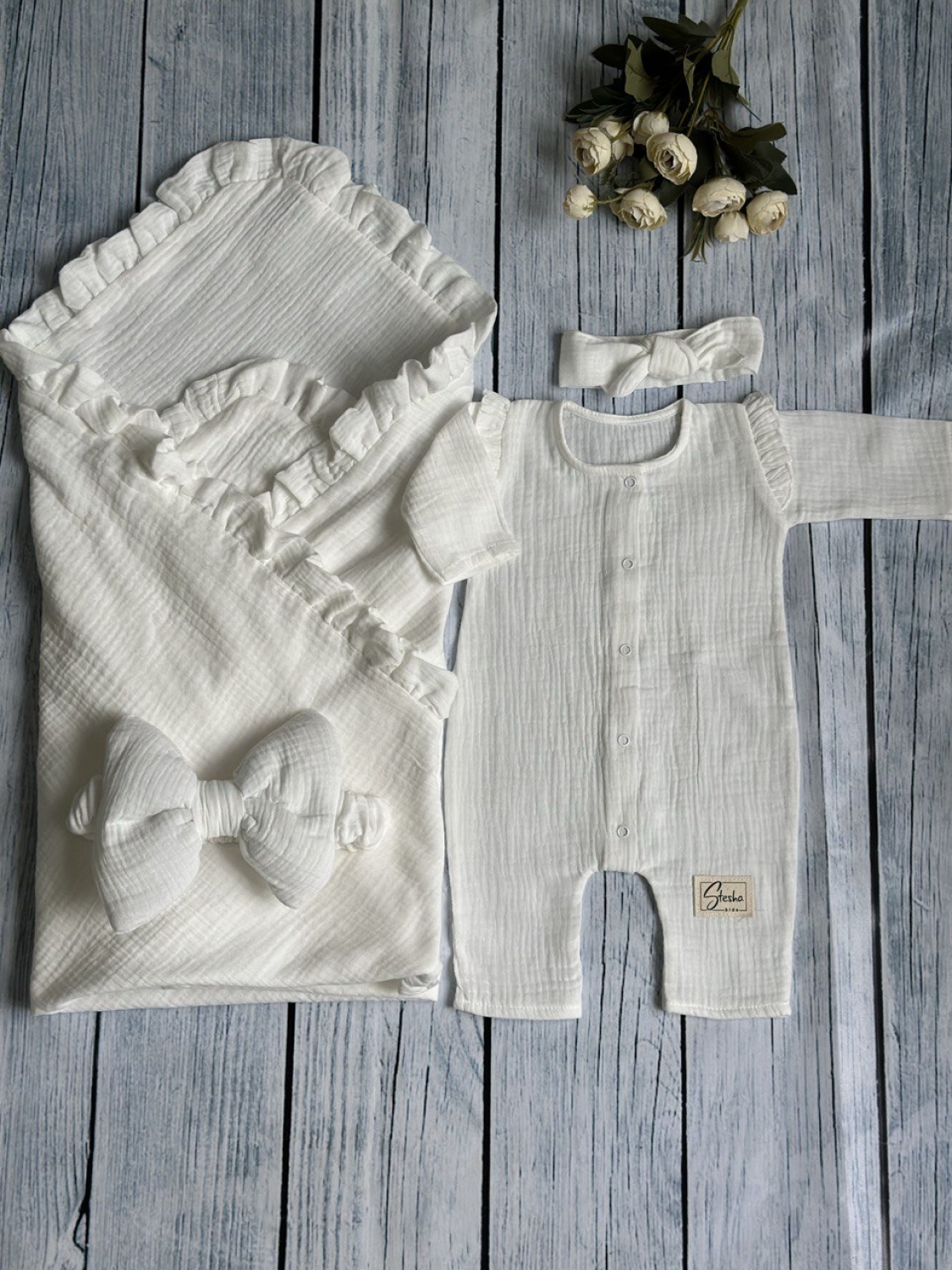 Теги: Купить детские конверты, комбинезон оптом, детские конверты на выписку оптом. 335-М. Комплект из детского комбинезона, р 56 и конверта муслин, хлопок 100% 90/90 см, молочный цена,отзывы официальный сайт "Стеша Озёрск"